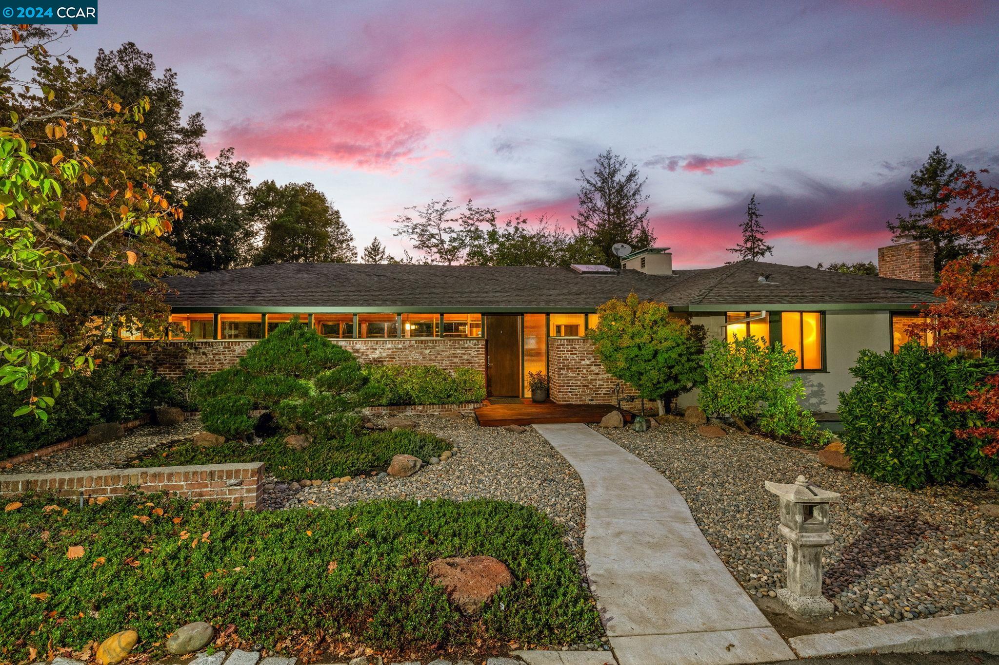 This sophisticated & substantial mid-century home boasts a spacious great room with a stunning wall of glass overlooking the peaceful backyard, creating a seamless connection between indoor and outdoor living, 4 bedrooms plus an office, and 2.5 baths spanning over 2700 sq ft. A magical backyard, made for relaxation, showcases a gorgeous pond with water features, a charming pergola, a large patio, and multiple decks, all accented by beautiful landscaping. The kitchen maintains its original mid-century character featuring a center island, vaulted ceiling, and direct access to the backyard. The main level offers the quintessential office with charming built-ins and a fireplace, a generous primary ensuite, plus an additional bedroom, a full hall bath as well as a guest bath. Downstairs you'll find another bedroom, a second living room (or 4th bedroom), a laundry area, and access to the 2-car garage and extensive storage. A fabulous property with an unmatched architectural appeal that emphasizes serene living spaces that effortlessly flow to the outside garden areas. Conveniently located near downtown Orinda and within proximity to 13 years of highly rated schools, this property offers the perfect combination of tranquility and convenience. OPEN SAT & SUN 1-4